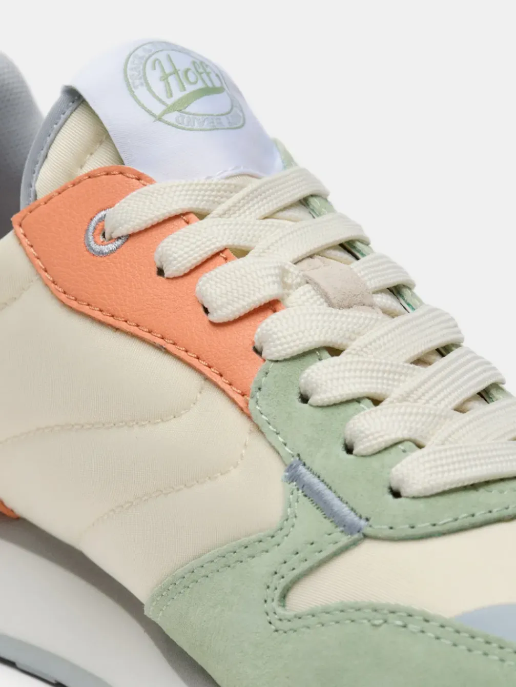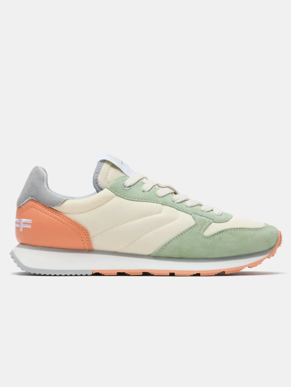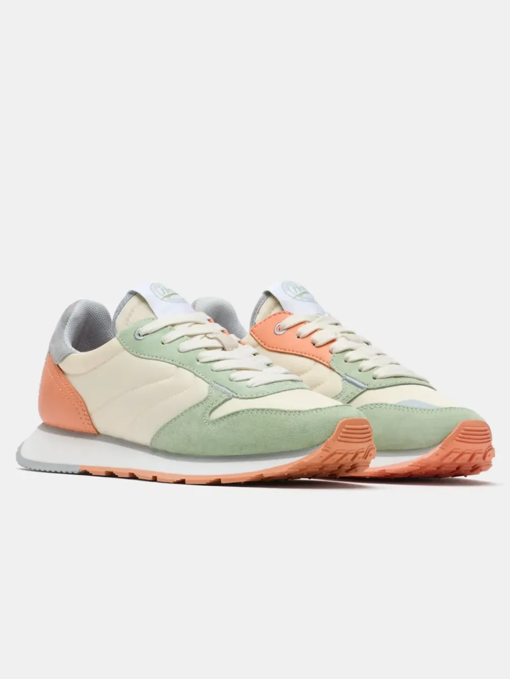 Voor Liefhebbers Van Retro- En Vintage-Stijlen Is De Kyrene In Crèmekleurig Nylon Met Asymmetrische Details In Groen Suède En Zalmleer De Perfecte Mix Om Overal Een Uniek Statement Te Maken. De Met Wafel Ontworpen Zool In De Kleuren Groen, Oranje En Grijs, In Combinatie Met Het Reliëflogo En Het Grijze Rubberen Detail, Is De Kers Op De Taart. Hun Lichtgewicht Gevoel En Comfort Zijn Gegarandeerd Dankzij De Binnenzool Van Traagschuim. Perfect Om Te Combineren Met Klassieke Jeans En Je Favoriete T-Shirt Om Een Nieuwe Stad Met Veel Stijl Te Verkennen.
