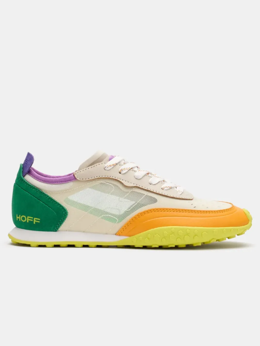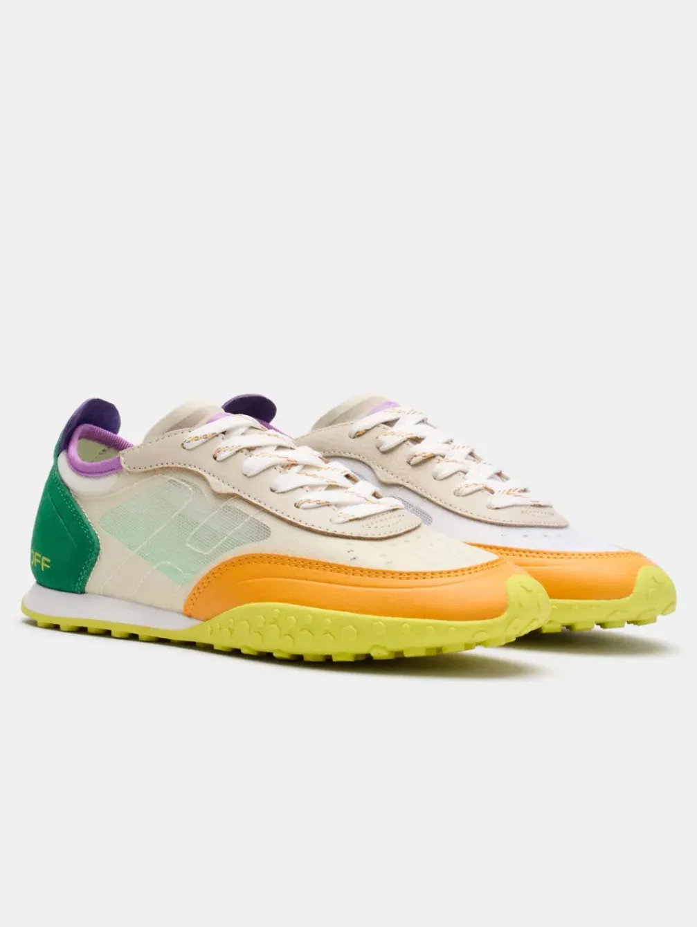 Lichtheid En Frisheid In Één Enkele Sneaker. De Bird Robin Biedt Een Ontwerp Dat Net Zo Uniek Is Als Ideaal Voor Zomerdagen, Waar Comfort En Stijl Uw Eerste Prioriteit Is. Transparant Gaas Aan De Zijkanten, Mosterdleer En De Gele Rubberen Zool Met Studs Zijn Niet Alleen Een Knipoog Naar Voetbalsneakers, Maar Zorgen Er, In Combinatie Met De Flexibele Tong En Structuur, Ook Voor Dat Je Je Favoriete Steden Wilt Verkennen Zonder Moe Te Worden. Het Contrast Met Groen En Lila Geeft Ze Een Ongeëvenaard Tintje Aan Je Uiterlijk. Combineer Ze Met Een Spijkerrok Of Een Oversized Broek.