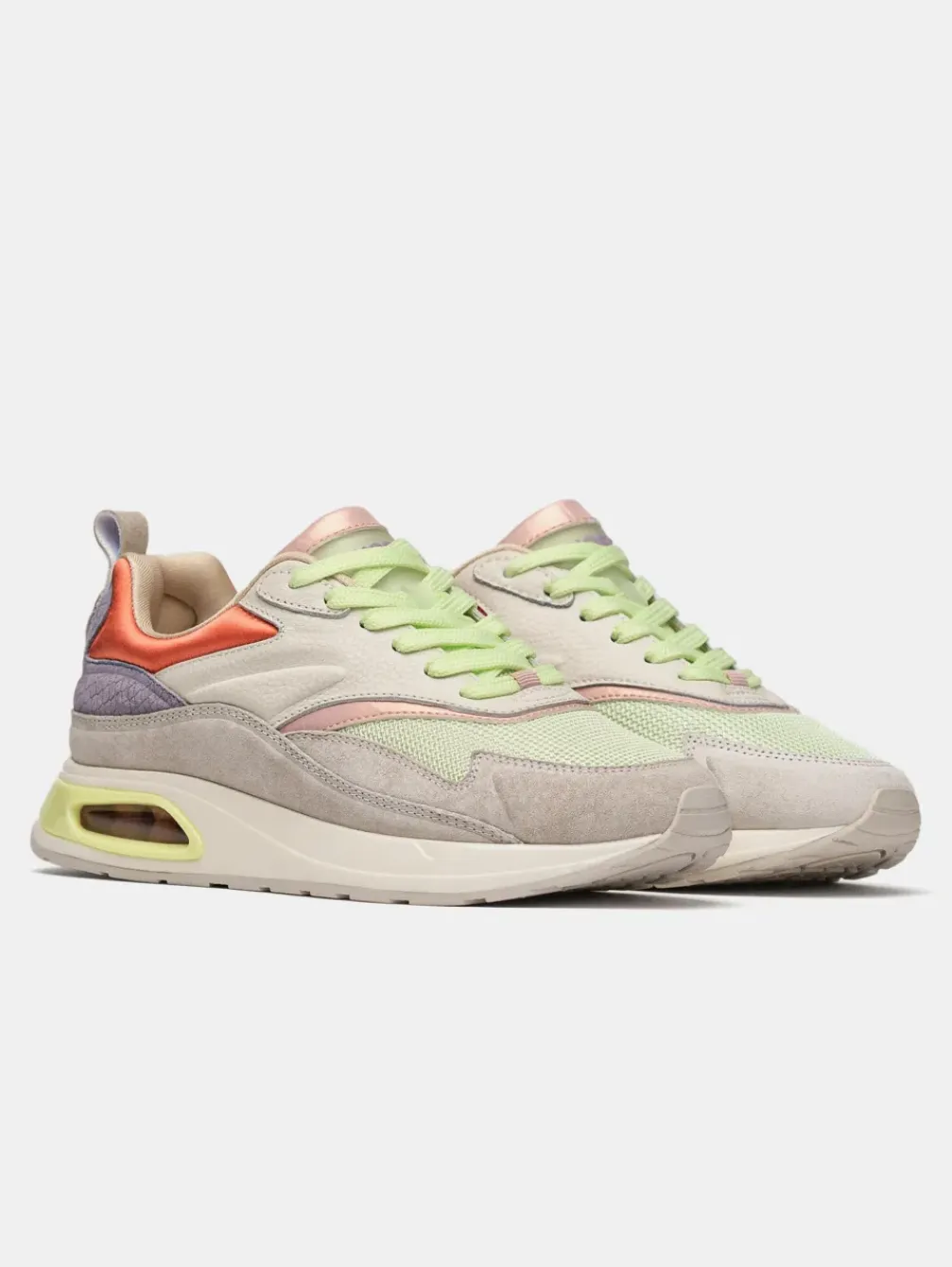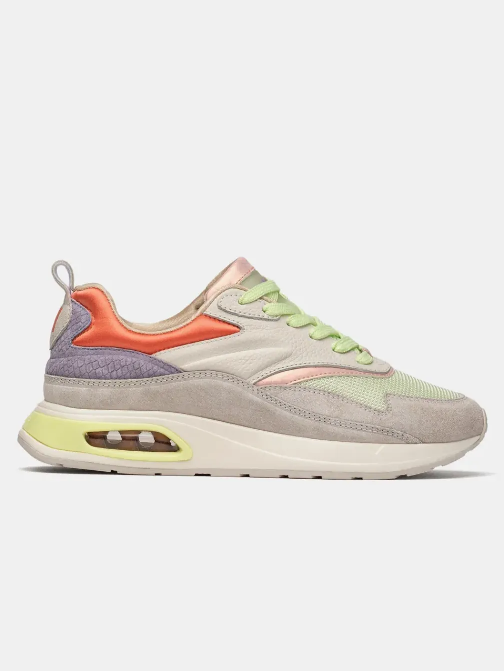 Met Een Iconisch Silhouet Uit De Jaren 90 Zijn De Sacre Coeur Unieke Hardloopschoenen Vanwege Hun Scala Aan Kleuren En Materiaalcombinaties. Details In Grijs En Lichtblauw Leer En Suède Contrasteren Met Een Satijnen Stof In Koraaltint Aan De Bovenkant. De Limoengroene Veters En De Verhoogde Lila Slangenprint H Van Hoff Voegen Accenten Toe Die Deze Sneakers Tot Een Maatstaf Maken. Een Garderobe-Essential Met Essentiële Stijl, Ondersteund Door Het Comfort Van De Binnenzool Van Traagschuim En De Luchtkamer In Een Pastelgroene Tint.