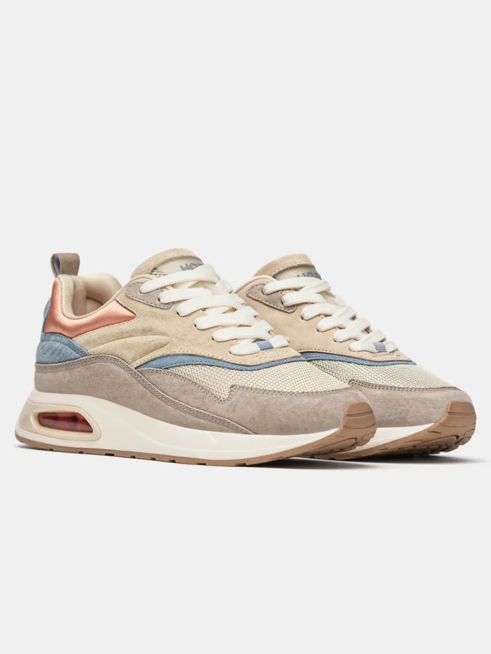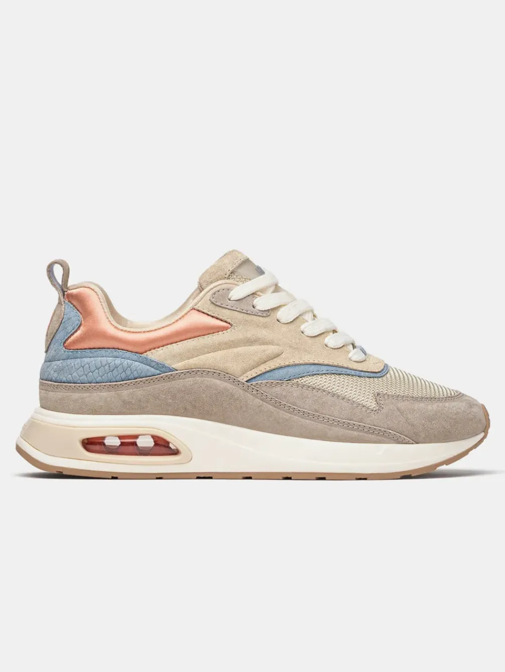 Met Een Iconisch Silhouet Uit De Jaren 90 Vallen De Taj Mahal Sneakers Op Door Hun Scala Aan Kleuren En Texturen. Details In Leer En Suède In Grijstinten, Beige En Blauw Contrasteren Met Een Koraal Satijnen Stof Aan De Bovenkant. De H Of Hoff Contrasteert Met Het Suède, Met Lederen Details Met Slangenpatroon, Terwijl Het Grijze Gaas Op De Neus Een Definiërende Toets Toevoegt Aan Deze Unieke Sneakers. Een Fundamentele, Stijlvolle Must-Have In Elke Garderobe, Ondersteund Door Het Comfort Van Inlegzolen Van Traagschuim En Een Crèmekleurige Zool Met Luchtkussen.