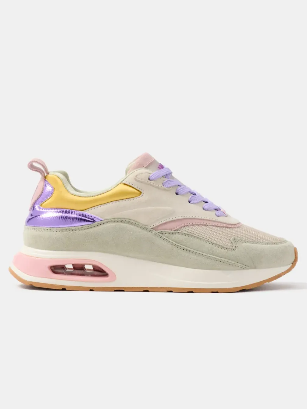 Met Een Iconisch Silhouet Uit De Jaren 90 Zijn De Parthenon Unieke Hardloopschoenen Vanwege Hun Kleuren En Materialen. Detail Van Suède In Groene En Beige Tinten, Contrasterend Met Satijngouden Stof Aan De Bovenkant. De Lila Veters En De H Van Hoff-Markering Op Het Metallic Geven Het Een Uniek Tintje. Een Basic Met Stijl Die In Geen Enkele Garderobe Mag Ontbreken, Ondersteund Door Het Comfort Van De Binnenzool Van Traagschuim En De Luchtkamer In Een Roze Tint.